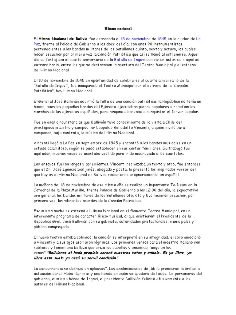 Leopoldo benedetto vincenti, nació en roma, cursó estudios en el conservatorio. Oficializ( el himno nacional de bolivia % se mand(. El himno nacional de bolivia fue escuchado por primera vez el 18 de noviembre de 1845, frente al palacio de gobierno, en la ciudad de la paz, los el día elegido para presentar el himno nacional boliviano fue cuando se celebraba el cuarto aniversario de la batalla de ingavi, para conmemorarlo. El himno nacional fue escuchado por primera vez un 18 de noviembre de 1845, frente al palacio de gobierno, en la ciudad de la paz. José ignacio de sanjinés, autor de la letra del himno nacional, jurisconsulto, legislador y poeta, nació en chuquisaca en el año 1786 y murió en sucre el 15 de agosto de 1864.